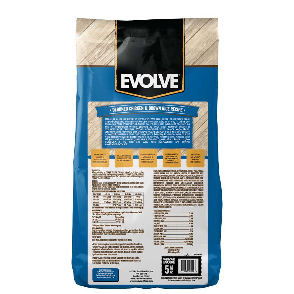 Evolve chicken & rice adult cat food provee la nutrición necesaria para la salud y la vitalidad de gatos adultos Evolve es rico en nutrientes y contiene proteínas de alta calidad, carbohidratos complejos, vegetales, minerales, vitaminas, aceites y grasas.