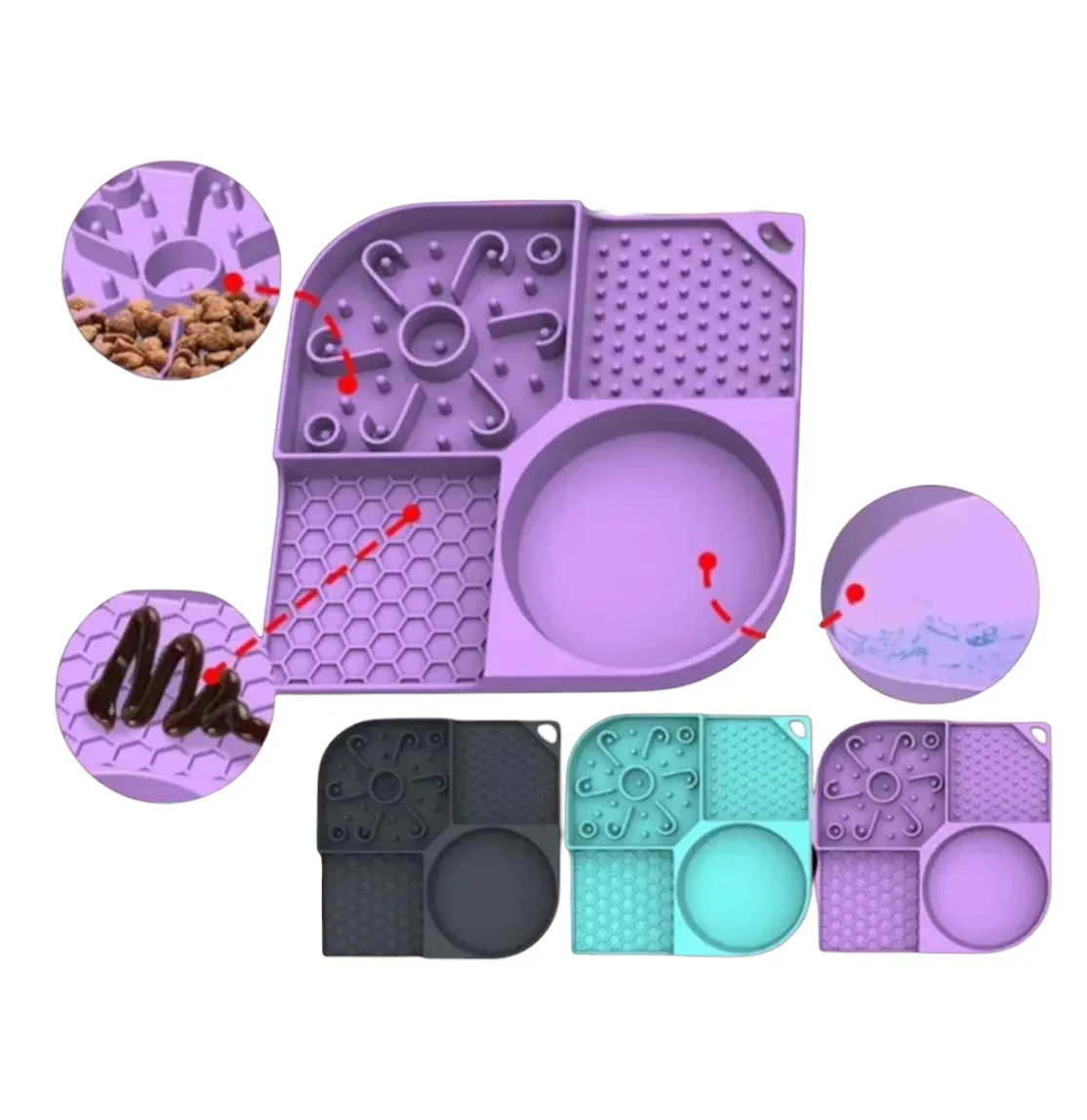 -Estimulación mental y antiestrés -Ideal para snacks, patés y alimento húmedo -3 texturas diferentes para mayor diversión -Incluye comedero para raciones pequeñas -Silicona segura y fácil de lavar -Material antideslizante -Para perros y gatos Medidas de 21,1 cm x 21,1 cm