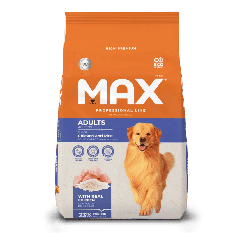Max Professional Line Adults Chicken and Rice es un alimento seco premium especial diseñado para cubrir las necesidades nutricionales de perros adultos. Su fórmula está elaborada con ingredientes seleccionados que aportan proteínas de alta calidad, energía y nutrientes esenciales para mantener la salud y vitalidad del perro en su etapa adulta. Este alimento también incluye prebióticos que favorecen la salud digestiva y mejoran la absorción de nutrientes. La presencia de extracto de yucca contribuye a reducir el volumen y el olor de las heces, ayudando a mantener una mejor higiene. Su fórmula se complementa con vitaminas, minerales y ácidos grasos que ayudan a mantener la piel saludable, el pelaje brillante y un metabolismo equilibrado.